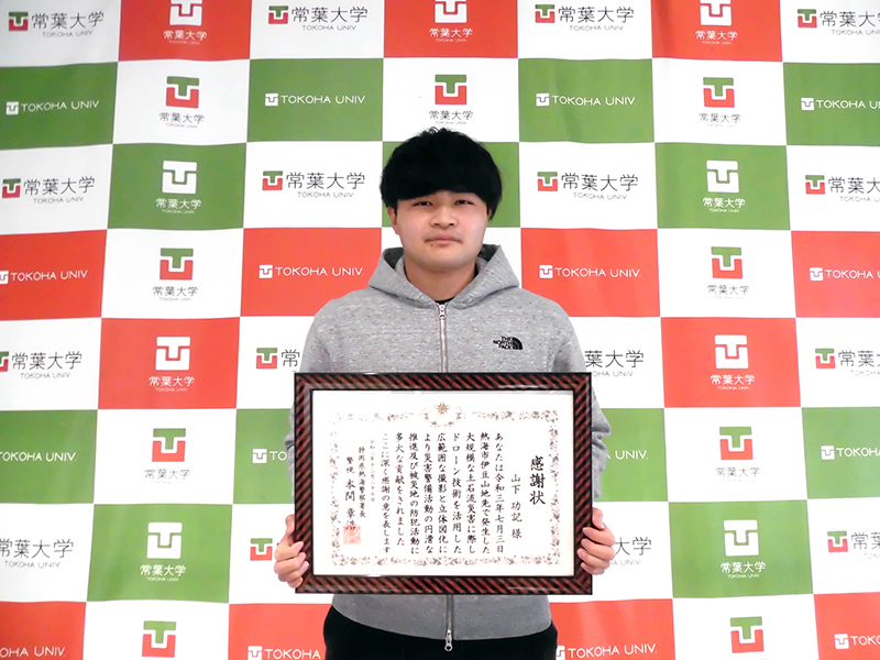 静岡草薙キャンパス教育学部生涯学習学科3年 山下功記さんが、静岡県熱海警察署長より感謝状を贈呈されました。
