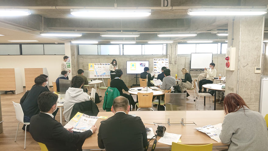 当日の報告会では、全体の概要説明に続き、代表のゼミ生が先行事例調査報告、フィールド調査報告、マップの説明と富士市へのご提案を、実際にコースを走ったリアルな声を交えて紹介しました。