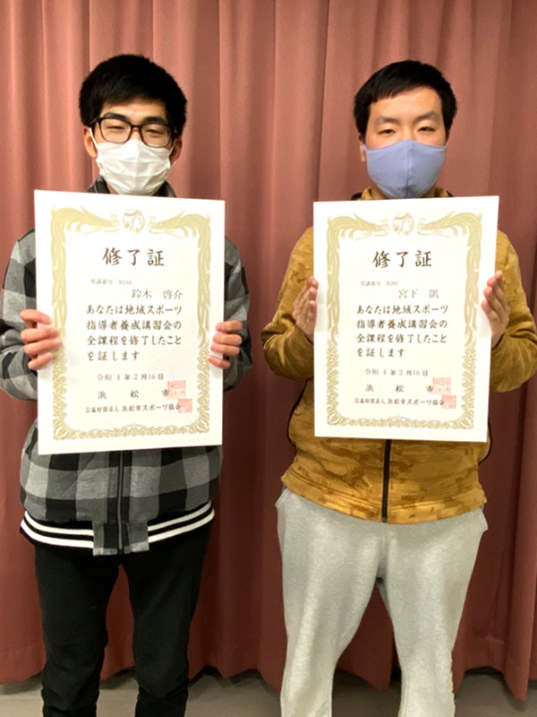 2月16日(水曜日)、浜松アリーナ研修室で、「令和3年度 浜松市スポーツ指導者養成講習会修了式」が行われ、健康プロデュース学部健康柔道整復学科の2名が修了証を授与されました。