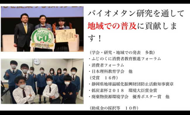 | 「小規模バイオメタン施設の開発と地域への普及」 | 静岡理工科大学星陵高等学校 星陵ラボ・バイオメタン班 |