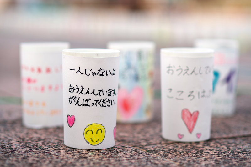 2800灯のキャンドルには市内の小中学生らが被災地への願いを込めたメッセージカードが巻かれていました。
