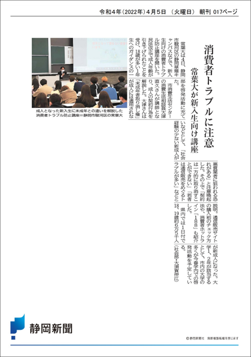 4月4日(月曜日)、静岡草薙キャンパス新入生を対象に静岡市消費生活センターの消費生活相談員 大津直久様を講師にお招きし、消費者トラブル等について啓発活動をおこないました。新入生は、「未成年者取り消し権」が成人には適用されないなどの注意喚起に、真剣な顔で聞き入っていました。 学生の皆さんは、「18歳から大人」として、慎重な行動を心がけてください。 常葉大学・短期大学部 成年年齢の引き下げについて(2022年4月1日から) 静岡新聞 令和4年4月5日掲載 (画像クリックで拡大します)