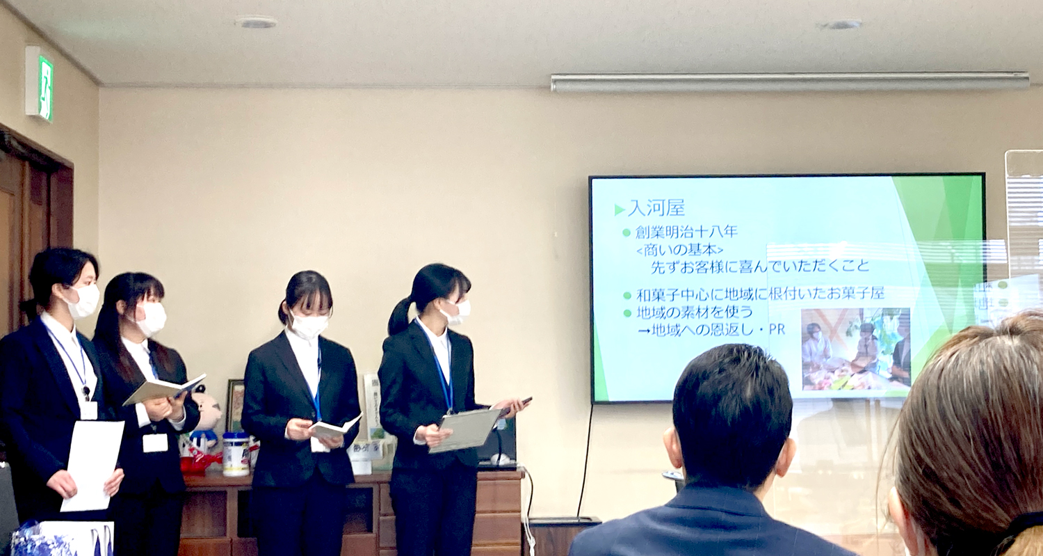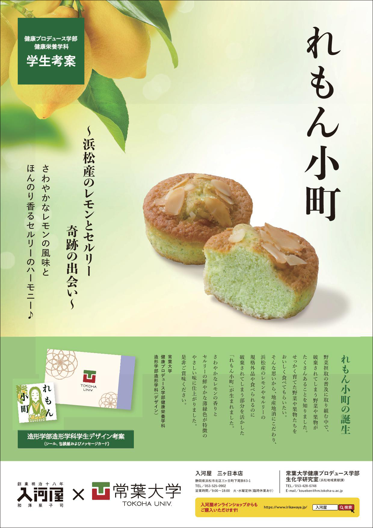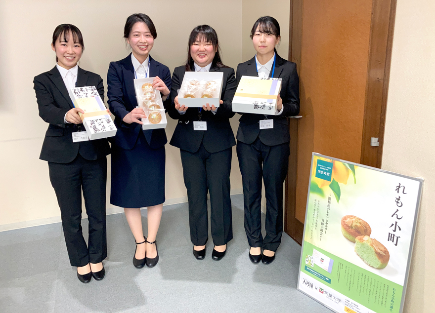 このたび、健康プロデュース学部健康栄養学科の学生有志5名は、創業明治18年の老舗和洋菓子店「入河屋」の協力のもと「れもん小町」を開発しました。