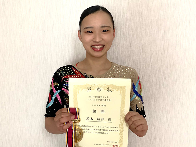 3月16日(水曜日)に「第17回全国フライトエアロビック選手権大会」が動画審査で行われ、本エアロビック部の鈴木清香さん(心身マネジメント学科4年)がシニアA部門(学生・社会人)で優勝しました。