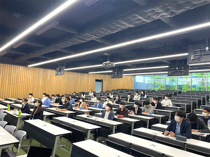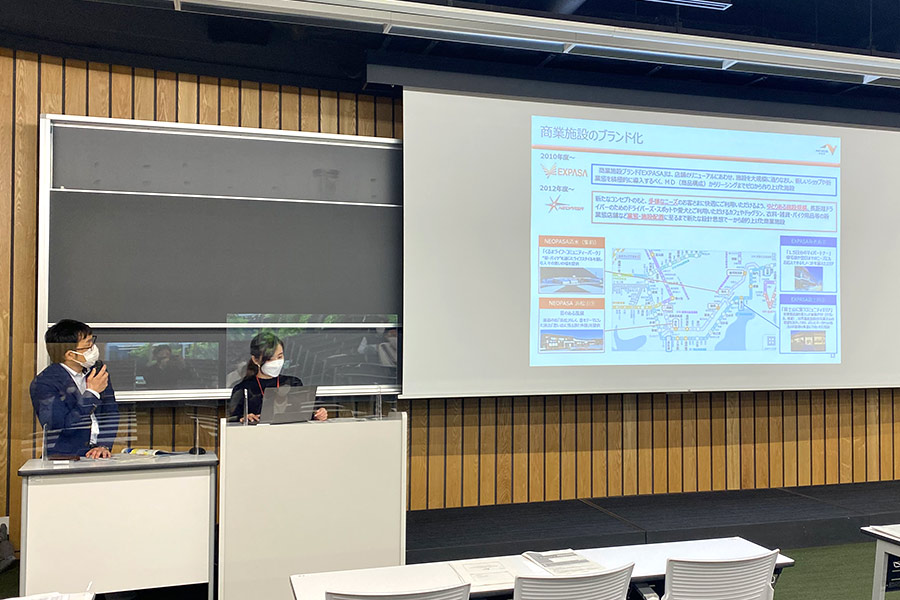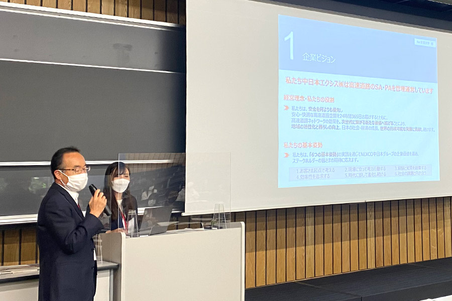 続いて、学生が事前に送付した質問への回答を交えながら、NEXCO中日本と中日本エクシス株式会社のご担当の方々による企業概要の紹介とプレゼンテーションが行われました。