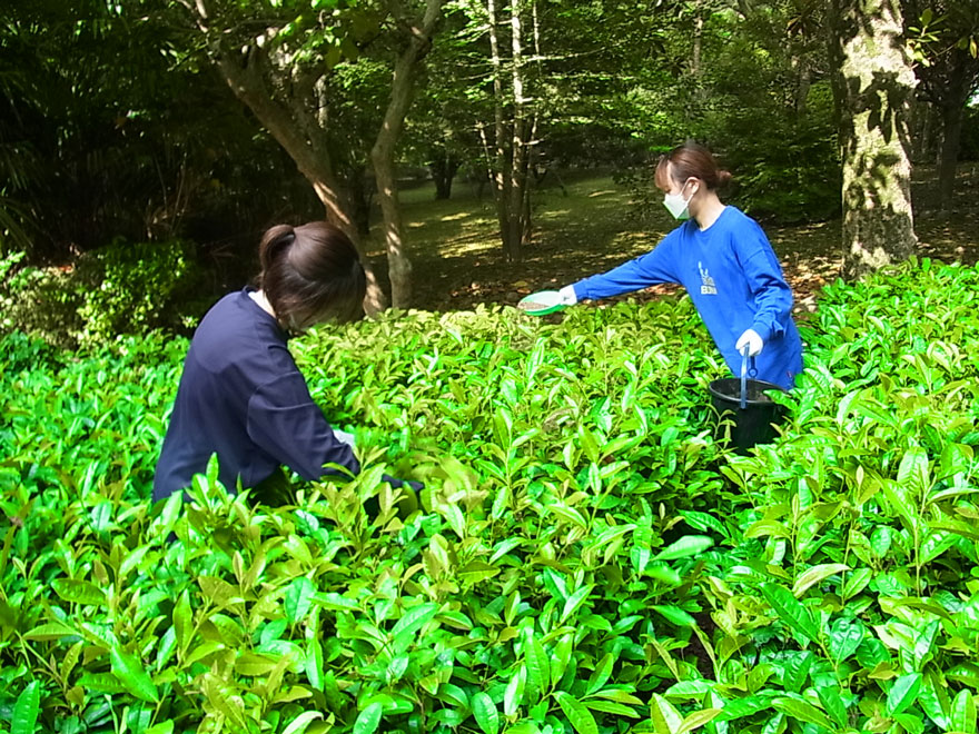 また午後には、静岡県立美術館に移動し、県立美術館のボランティアの皆さんとともに、敷地内にある杉山彦三郎試験茶畑にて除草と肥料やりの作業を行いました。
