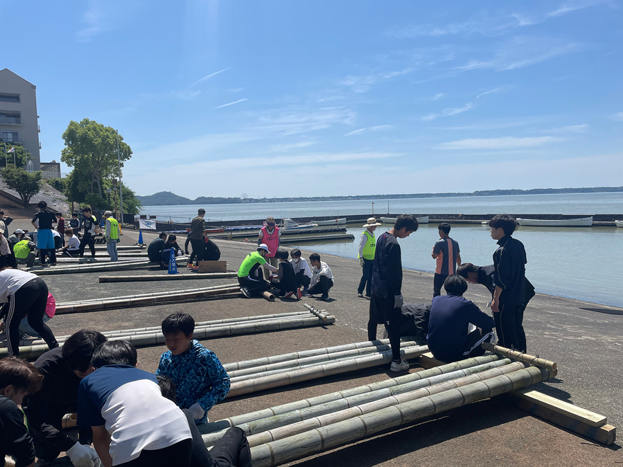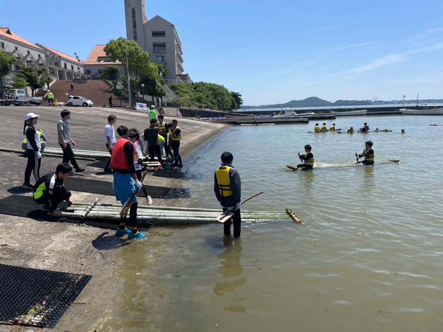 浜松キャンパスの学生が5月29日(日曜日)、浜松市の三ケ日青年の家にて、竹林整備で伐採した竹を活用した「いかだづくり」体験を行いました。