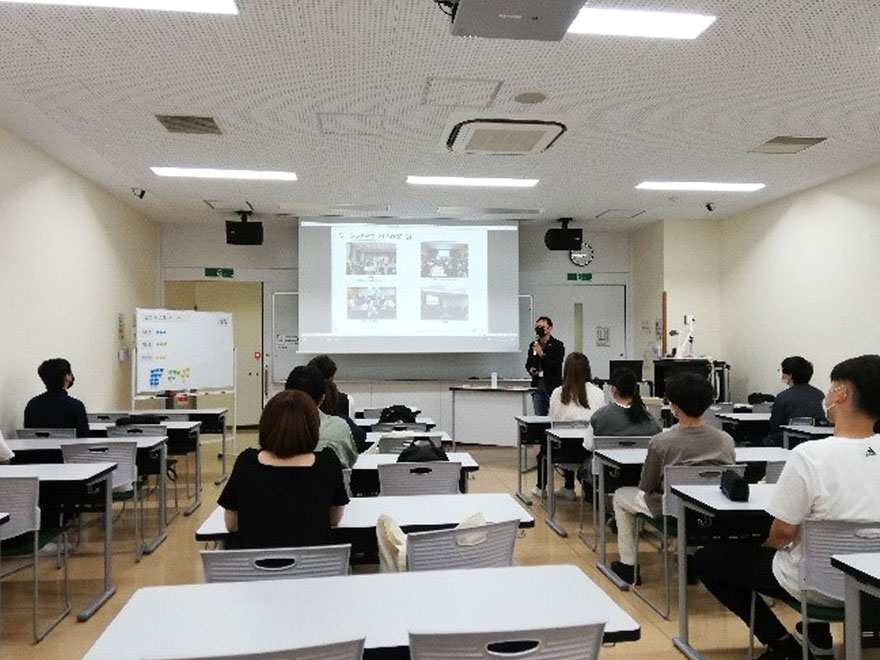 早速、ゼミで学生がファシリテーターとなり議論を進め、自分たちが日常生活の中で取り組めるものとして「エコバックの利用、フードロス、公共交通機関の利用、衣服のリサイクル、節水・節電、ボランティア活動やコミュニティ活動への参加」などのアイディアが挙がりました。