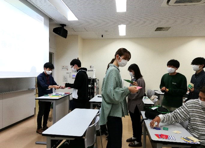 6月7日(火曜日)と14日(火曜日)には、一般社団法人ローカルSDGsネットワークの講師の指導の下、「2030SDGsカードゲーム」を体験しました。これは、SDGsの17の目標を達成するために、現在から2030年までの道のりを体験するゲームです。「なぜSDGsが私たちの世界に必要なのか」「SDGsがあることによってどんな変化や可能性があるのか」を体験と共に理解するためのゲームで、与えられたお金と時間を使いプロジェクト活動を行うことで、最終的にゴールの達成を目指すというものです。