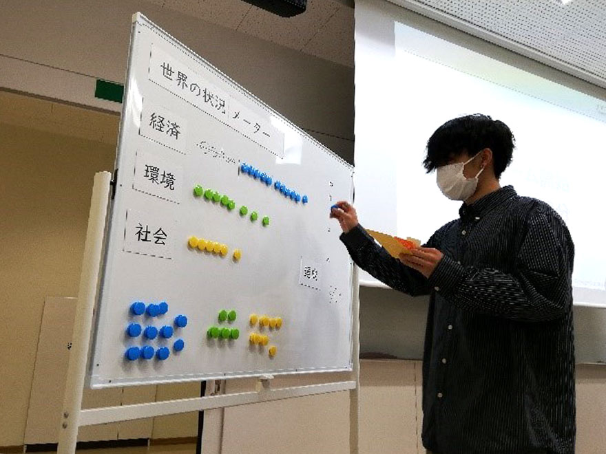 ゲームの前半は、世界の状況メーターのうち経済だけが伸び、環境と社会は後退してしまいます。後半になると、周りの学生と協力しながら環境と社会のバロメーターを意識しプロジェクトを進めると、世界の状況メーターは改善し、学生全員の目標も達成することができました。
