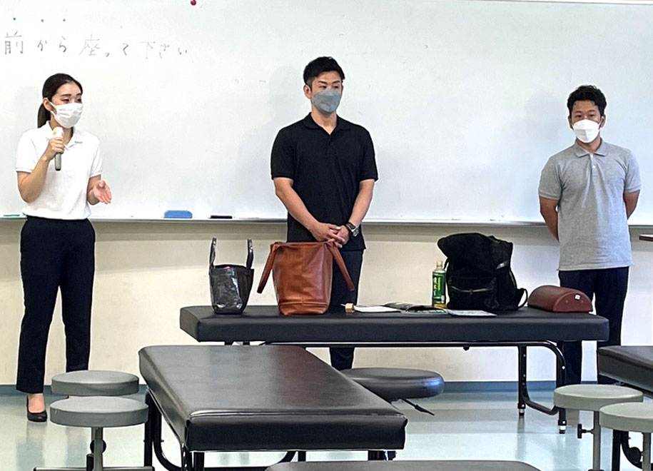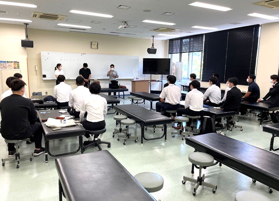 6月29日(水曜日)、健康プロデュース学部健康柔道整復学科3・4年生を対象に、わだち整骨院(株式会社わだちグループ)の坂本陽介代表、安田孝次先生、阿部智里先生をお招きし、令和4年度第1回キャリア交流会を開催しました。