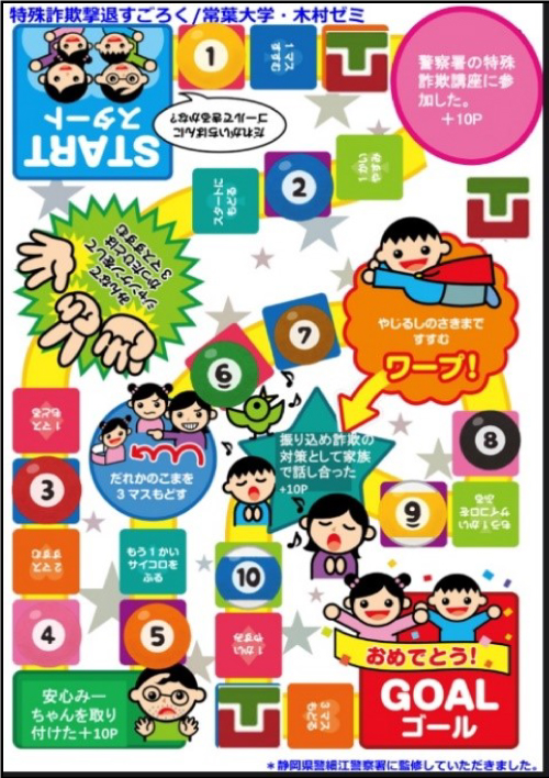 講座では静岡県細江警察署の監修のもと、木村ゼミの学生が作成した「特殊詐欺すごろく」が教材として使われました。止まったマスに応じて特殊詐欺に関するクイズに答え、振り返りをしながら被害を回避する方法や手口についても動画付きでレクチャーしました。