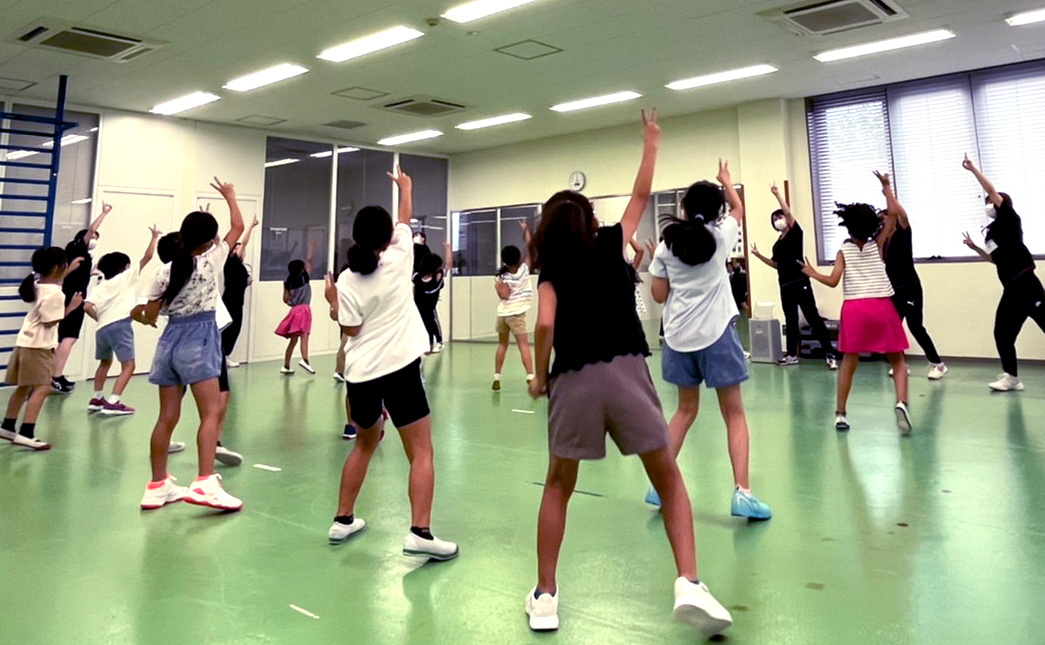 「みんなでLet’s dancing!!」では、軽快な音楽のビートにのって楽しく運動し、学生インストラクターの動きに合わせ、エアロビクスで汗を流しました。