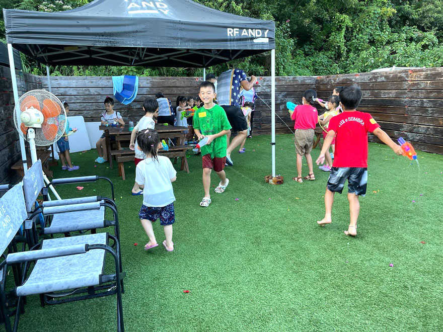 前半の水遊びでは、それぞれ持参した水鉄砲を手に撃ち合い、子どもも学生もびしょぬれになりながら夏の夜のひと時を本気で楽しみました。
