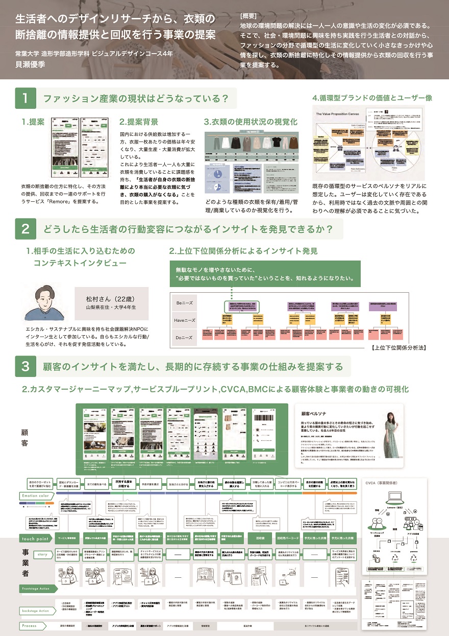 【発表者】貝瀬優季さん(造形学部4年) 生活者へのデザインリサーチから、衣類の断捨離の情報提供と回収を行う事業の提案