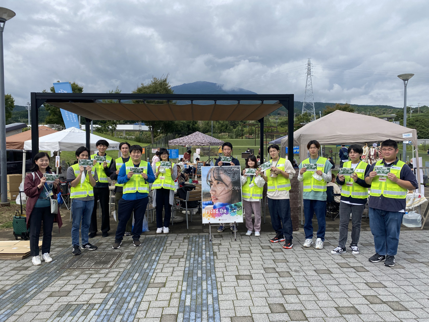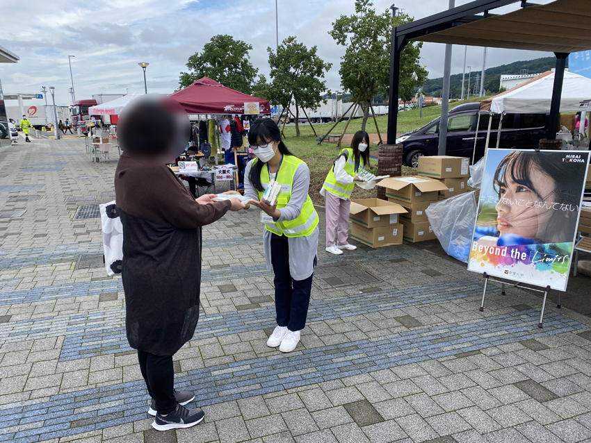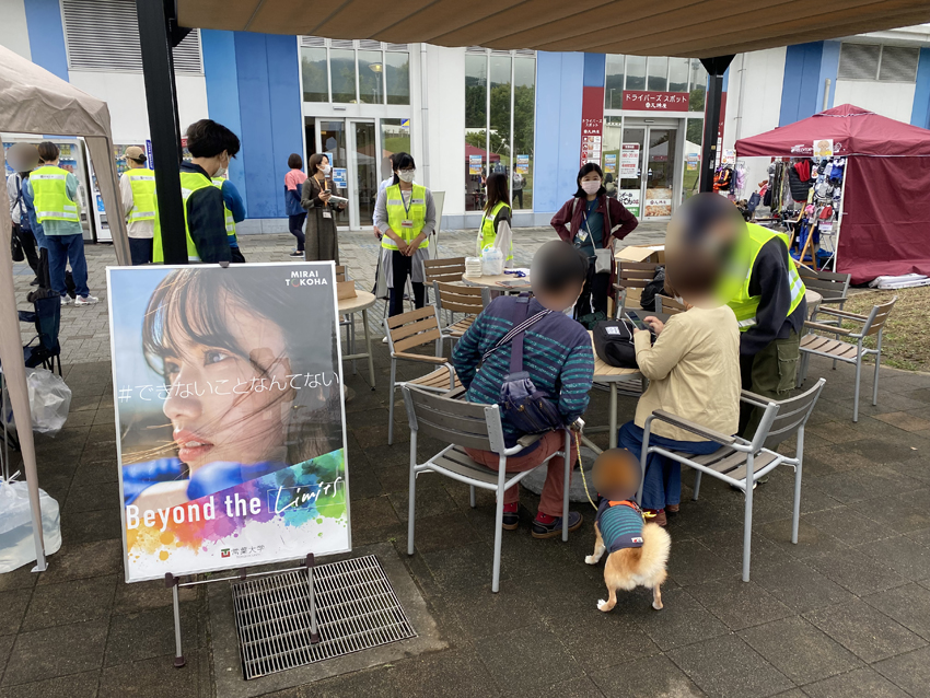 当日は、NEXCO中日本と中日本エクシス株式会社の協力を得て、山田ゼミ・小豆川ゼミ所属の10名の学生が駿河湾沼津サービスエリア内で製作したペーパータオル(2,000個)をドッグラン利用者と来場者に配布しました。