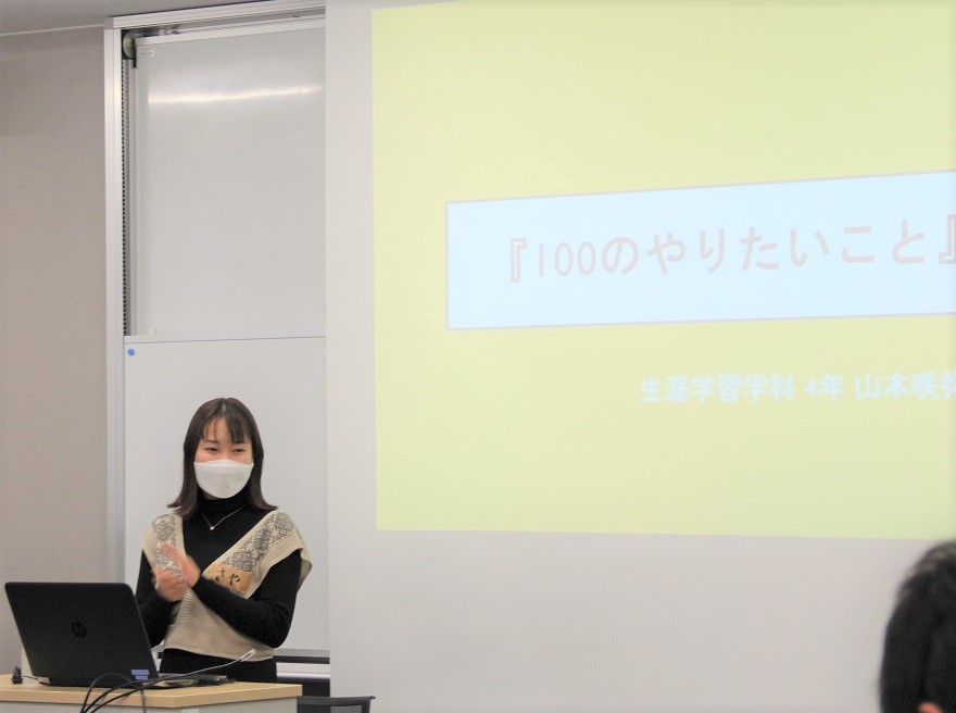 第1回目の先輩話し手は、山本咲弥さん(教育学部生涯学習学科4年)で、12名の学生が集まりました。落ち込んだ時期から復活し、やりたいことに挑戦するきっかけとなった「100のやりたいこと」ワークを試して共有し、10年後の自分になりきって語り合いました。
