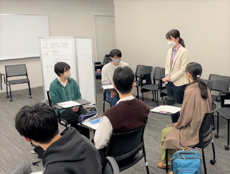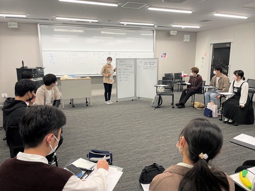 これは、学外の就活演習に参加した学修ピアサポーターが、学内に企画を持ち込んで実施したもので、教育学部生涯学習学科の学生13名が参加しました。