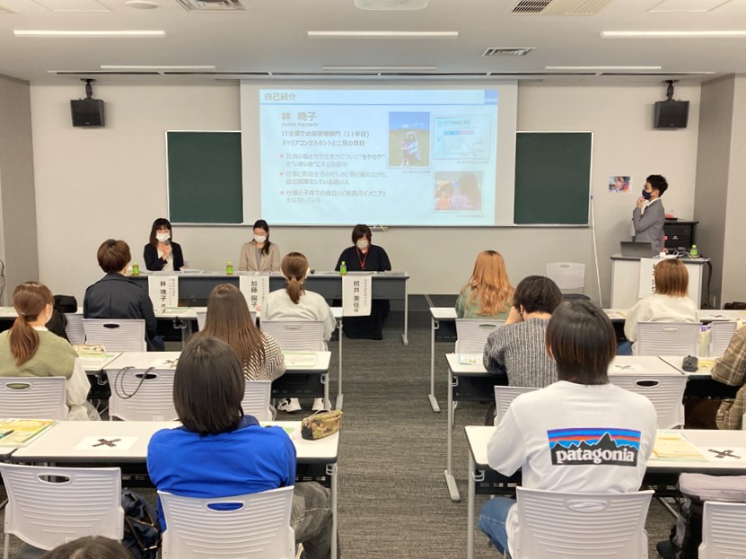 まずはじめに、パネリストが所属する企業と現在の仕事や職業観・キャリア等のご紹介とパネルディスカッションが行われました。その後、3つのグループに分かれ、パネリストがそれぞれのグループを移動しながら、就職動機・仕事のやりがい・苦労したこと・家事や子育ての両立方法等について学生の個別の質問に回答するコーナーが設けられました。
