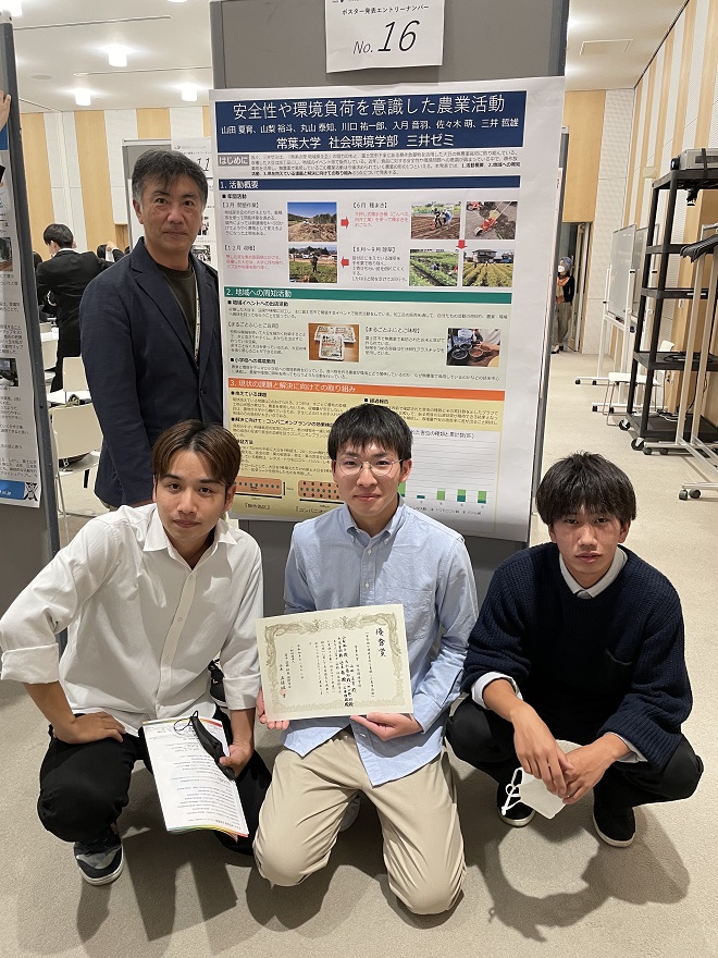 社会環境学部 三井ゼミでは、11月12日(土曜日)プラサヴェルデ(沼津市)で開催された富士・箱根・伊豆 国際学会による「2022 FHIXフォーラム」に「安全性と環境負荷を意識した農業活動」という演題でポスター発表を行い、優秀賞を受賞しました。