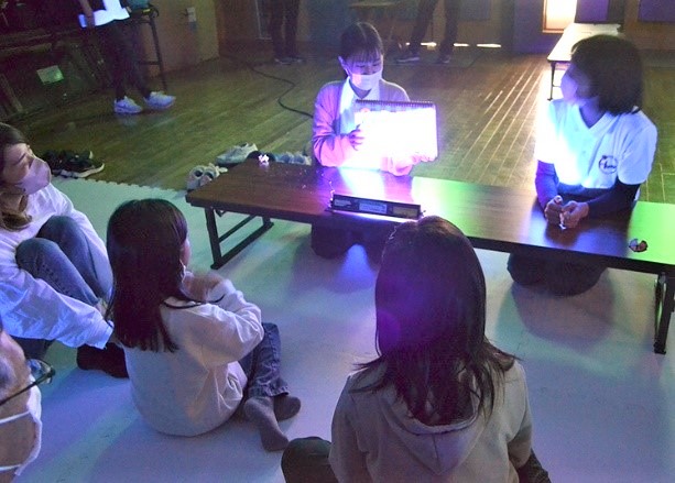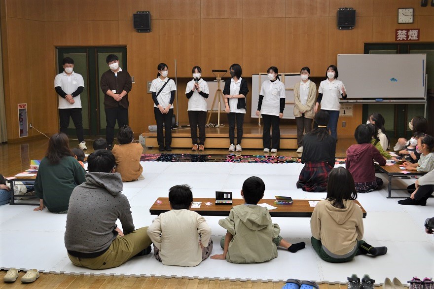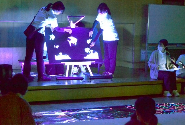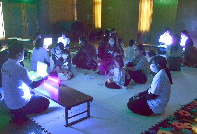 参加した守屋吏彩子さん(作業療法学科4年)は「今回初めてスヌーズレンの実践を行い、暗い中、子どもたちの反応を見ながらの進行で上手くいかない部分もあったが、子どもたちが楽しそうに紙芝居に見入っている姿を見ることができ嬉しかった。また、講座を企画・実践する体験ができとても勉強になった」と話しました。
