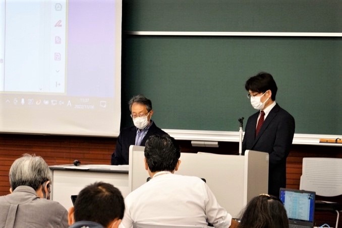 草薙キャンパス(B201教室)では144名、浜松キャンパス(本館412講義室)では6名、オンライン会場では7名が参加しました。両会場をzoomで繋ぎながら、勝俣元雅同窓会長(教育1期)の進行により、同窓会(全学)・同窓会静岡支部会・同窓会浜松支部会の令和3年度事業報告・収支決算や令和4年度事業計画・収支予算と静岡支部会による草薙キャンパス開学記念品「モニュメント電気時計」寄贈といった議事が報告されました。