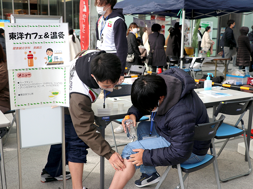健康鍼灸学科 美鍼会では個人に合わせてフローチャートで体の状態を理解してもらった後、体質・体調に合わせたハーブティーの提供や自分でできるツボ押し、冷えや痛み、疲労に効果的なペットボトル温灸の紹介をしました。参加した方は、熱心に説明を聞いてくださり、家でも実践していきたいと好評のブースでした。
