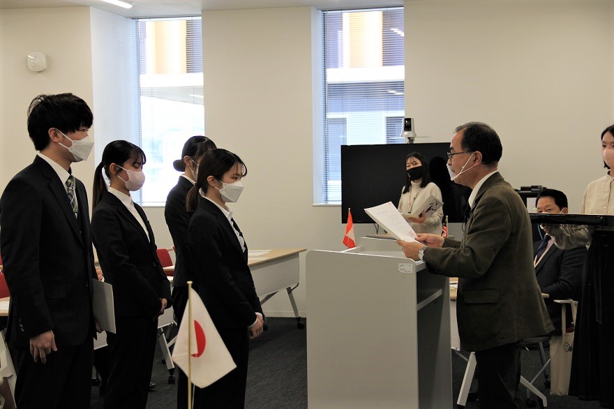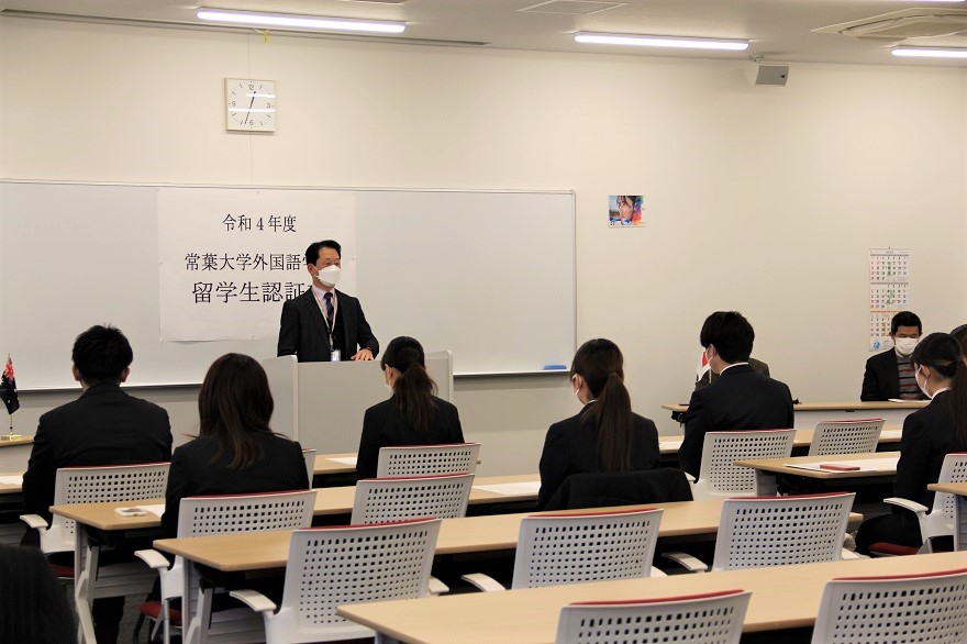 また、認証式では、草薙キャンパス安藤雅之副学長と戸田学部長が激励の言葉を述べ、派遣学生を代表して山下龍之介さん(英米語学科2年)