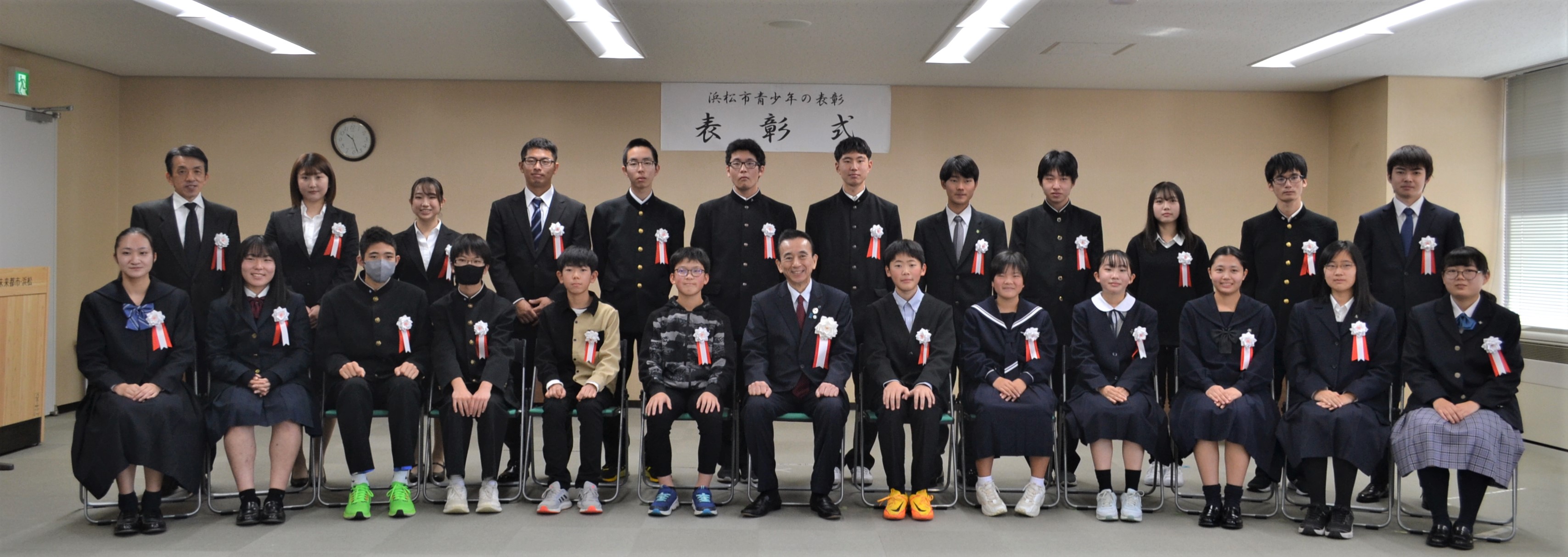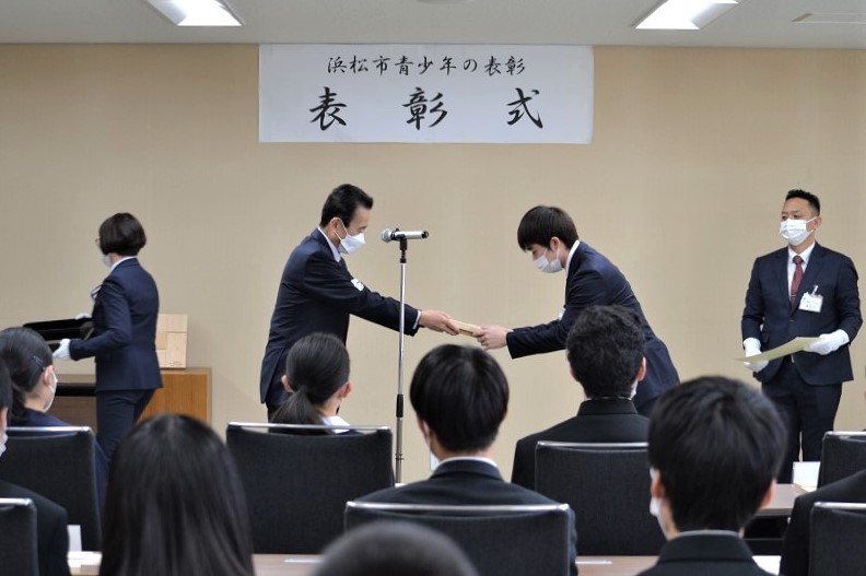 ボランティア活動や文化活動など、社会や他者のために地道に努力されている青少年や青少年団体を表彰する、『浜松市青少年の表彰』の表彰式が12月7日(水曜日)、浜松市役所で行われ、個人の部で山口大翔さん(保健医療学部理学療法学科4年)、団体の部でTeam Iが善行賞を受賞しました。この日は個人18名と5団体が表彰され、鈴木康友浜松市長から賞状と盾が授与されました。