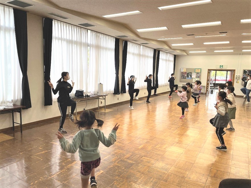 大学で学ぶ健康スポーツ知識をもとに、健康づくりや運動不足解消のための運動を遊びの要素も取り入れて親子で楽しめる企画を考えました。親子で音楽のビートにのって、エアロビクスダンスの基本のステップやエビカニクス、オリジナルの振り付けのダンスも交えて楽しく動きました。子どもたちからは「あまりダンスをしないけど、楽しくできました」「分かりやすく、楽しめるダンスでした」、保護者からは「親子で運動する機会をつくっていただき、ありがとうございました」とお言葉をいただきました。学生たちにとっても貴重な体験となり、地域の子どもたちに教えることで学生自身の知識や理解を深めることにつながりました。