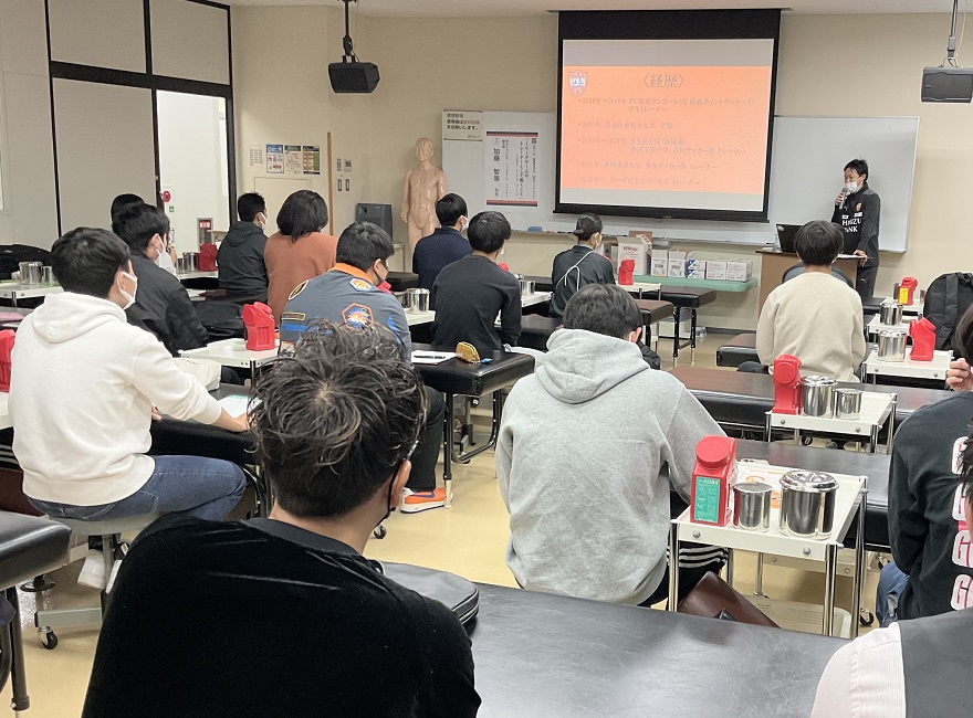 11月30日(水曜日)、健康プロデュース学部健康鍼灸学科では、清水エスパルストップチームのトレーナーである加藤智崇さん(トレーナー・鍼灸師)を招いて講演会を行いました。