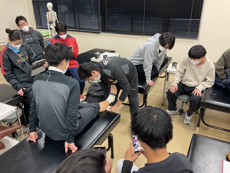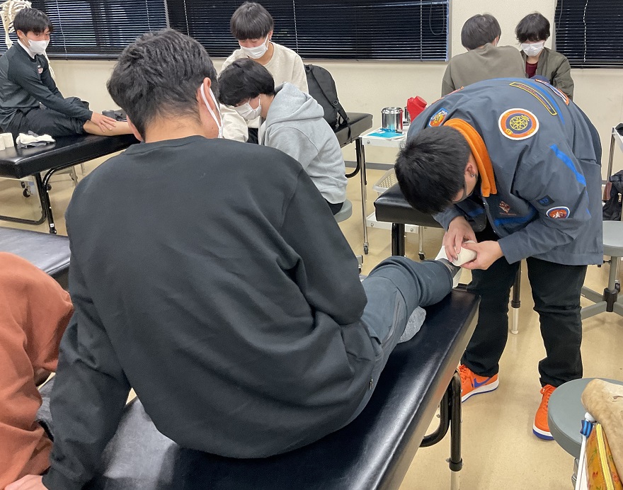 講義の後半ではテーピングの実技も行いました。プロサッカー選手にしている『素早く丁寧な』手技を見た後に、実際にやってみると思ったようにテーピングを巻けず、技術の高さに圧倒されました。学生からは、「講演に参加して良かった。勉強や治療の練習をもっとしっかりやりたい」「仕事の大変さ、コミュニケーションの重要性がよく分かった。自分もサッカーチームのトレーナーになれるように頑張りたい。」といった声が聞かれました。