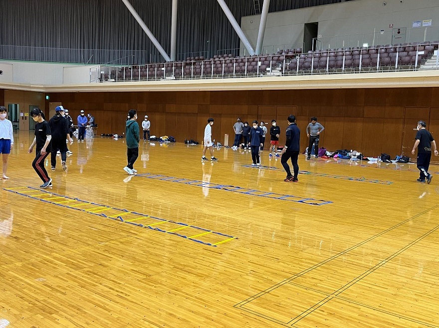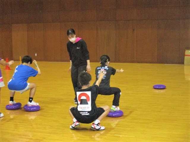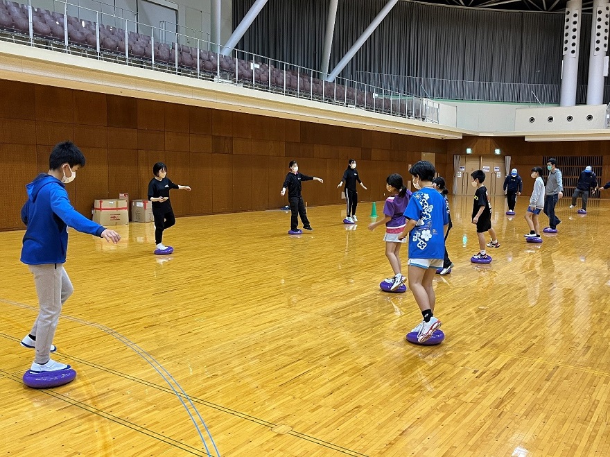 この講座は、浜松市スポーツ協会が主催して行われ、小中学生と保護者27名が参加しました。学生が授業で学んだ知識とスキルを活かして、運動神経を高めるコーディネーショントレーニング、敏捷性を高めるラダートレーニング、平衡感覚を養うバランスディスクトレーニング、ストレッチポールを使ったコンディショニングを指導しました。