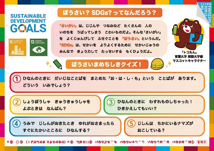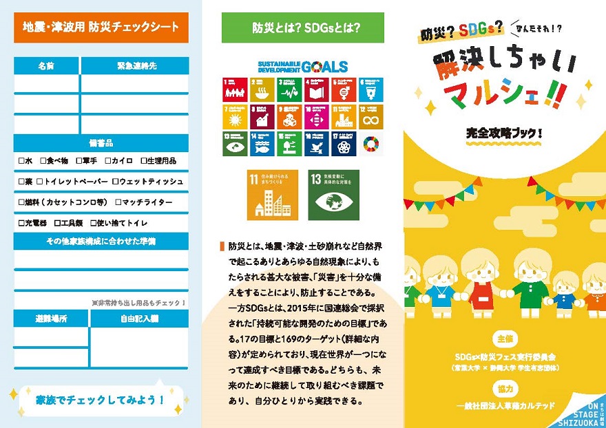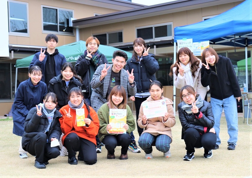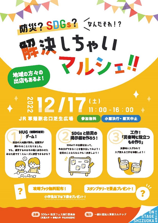 12月17日(土曜日)にJR草薙駅北口芝生広場で開催された、『防災?SDGs?なんだそれ?解決しちゃいマルシェ!』の企画・運営に、本学の学生有志17名が参加しました。このイベントは(一社)草薙カルテッド様ご協力のもと、本学の社会環境学部3年生の佐々木健太さんを中心として、本学学生・本学卒業生1名・静岡大学の学生有志2名が合同で企画しました。