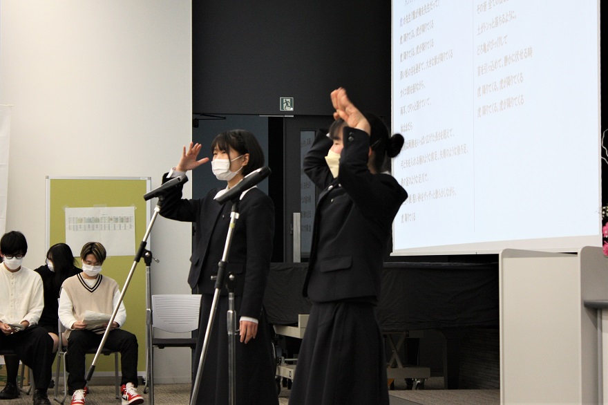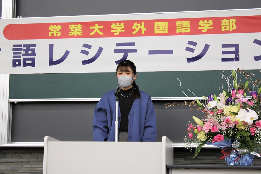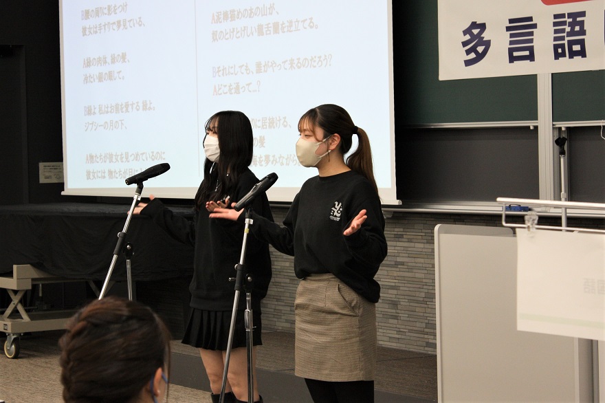 大会では、出場者は課題文の詩・戯曲の暗唱・朗誦を披露し、その暗唱力・発音・表現力が審査されました。会場からは出場者の熱唱に盛大な拍手が送られ、県内の3高校からの参加者による素晴らしい発表は本学生の意気を高めました。