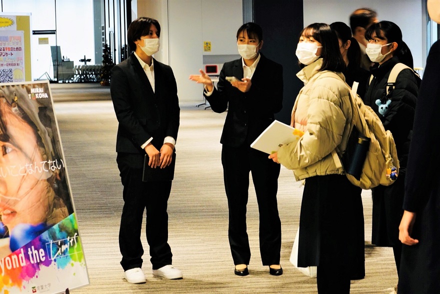また実行委員による特別企画として、参加した高校生を対象に学生が本学を案内する『草薙キャンパスツアー』が行われました。大会終了後には、希望者が参加する『交流会』も行われ、グローバルコミュニケーション学科の学びに関連するクイズ大会を楽しみました。本大会はこういった学生・生徒間の交流の場としても大切な役割を果たしています。