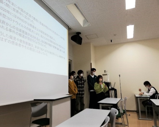「新型コロナ感染症によって表面化する差別について」のグループは、「なぜ感染症による差別が起きるようになったのか、どうしたら無くせるだろうか」という疑問から、現状調査や原因分析を進めました。差別が起きた原因としては、行政が発信する情報が入手しにくいこと、マスコミが発信する情報の信頼性が不確かであることなどの「社会的な視点による原因」と新型コロナ感染症から生じたストレスや不安・恐怖による「心理的な視点による原因」があると分析しました。これらの原因から差別を起こさないための解決策として、「社会的な視点」については、行政情報を理解しやすいようにHPを改善すること、国と地方自治体の連携強化、感染症対策の情報伝達の強化、マスメディアは国がまとめた信頼性の高い情報を発信することなどを提案しました。また、「心理的な視点」については、私たち自身がストレスを解消できるように自分の趣味を見つけること、正確な情報を取得し正しく理解すること、そのためには情報リテラシーを身に付ける必要があるとしました。学生たちは、今回の研究を通して、差別を無くすためには、私たちの意識の持ち方や行政の協力によって課題を解決することは可能であるとしていました。