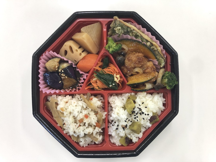 これは、本学浜松キャンパス健康プロデュース学部健康栄養学科の卒業研究として佐野文美ゼミの学生が取り組みました。お弁当を通じて「静岡県」を知って頂き、食べるだけで静岡を旅しているような気分になれるお弁当を目指しました。お弁当のネーミングの「アジわい」には、使用している「鯵」と「味」わってほしいという気持ちをかけています。鯵の磯辺天には浜名湖産の青のりを衣に使用し、磯の風味が感じられます。また、彩り野菜とオレンジチキンはみかんジュースを使用したタレに唐揚げを絡ませ、静岡県産のしめじを使用し、みかんのまろやかな酸味としめじの食感を楽しめるよう、様々な工夫を凝らしました。