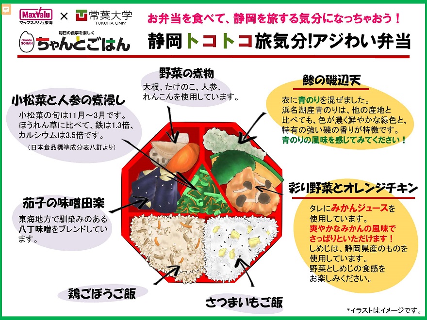 1月28日(土曜日)、29日(日曜日)に静岡県・愛知県・三重県のマックスバリュ東海全域と岐阜県・滋賀県・神奈川県・山梨県の限定店舗で常葉大学とマックスバリュ東海株式会社の共同開発したお弁当「静岡トコトコ旅気分!アジわい弁当」を販売いたします。