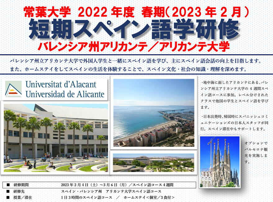 新型コロナウイルスのパンデミックにより中止されていた外国語学部のスペイン海外プログラムが3年ぶりに再開され、2月4日(土曜日)に外国語学部グローバルコミュニケーション学科生8名が羽田空港より出発しました。 本学の提携校であるアリカンテ大学の語学教育センターでショート留学生は8週間、語学研修生は4週間のスペイン語コースを受講します。 また文化学習の一環として、バルセロナやグラナダといった世界遺産を持つ街への小旅行も予定されています。 (画像クリックで拡大します) 関連リンク 外国語学部 外国語学部についてはこちら グローバルコミュニケーション学科 グローバルコミュニケーション学科についてはこちら