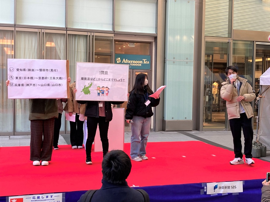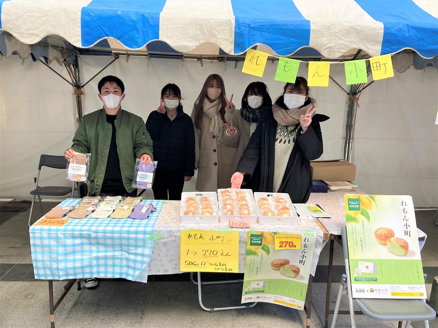 イベント当日は、運営だけでなく、事前に募集した写真コンテストの発表や姫街道の魅力調査の発表を担当し、多くの来場者に奥浜名湖の魅力知っていただくためのプログラムを実施しました。またこの地域は大河ドラマ『どうする家康』の舞台となることもあり、経営学部村瀬ゼミがドラマにちなんだ商品のPR、そして健康栄養学科TOKOFARMは同地域の老舗和菓子店と共同開発した『れもん小町』の販売をしました。