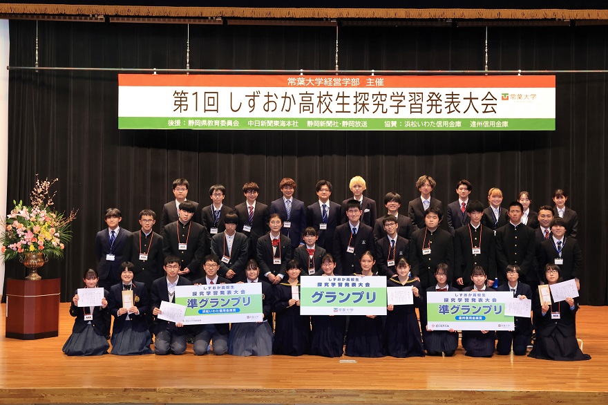 2023年2月4日(土曜日)浜松キャンパストコハホールにおいて、経営学部主催の第1回しずおか高校生探求学習発表大会を開催しました。当日は約80名(発表者・引率教員・大学教員・学生スタッフのほか、近隣高校の生徒など)の参加がありました。応募総数59作品の中から本学経営学部教員による厳正な審査を経て、第一次審査を通過した10チーム(発表大会直前に辞退があったため9チーム)による発表大会となりました。本大会の大きな特徴は、高校生が日頃から授業などを通じて行っている探求学習の発表の場にしたことです。昨年度まで全10回実施してきた「高校生ビジネスプランコンテスト」では、「ビジネスプランの部」「調査・研究の部」の2部門を設けていましたが、今大会の目的は、社会問題や地域の課題に対し、高校生の視点で問題意識を持ち探求した内容を発表するというところにありました。したがって、応募された作品のテーマも多岐にわたり、それぞれの高校生の身近な問題点についてフレッシュな視点で考えられたものが多く見られました。