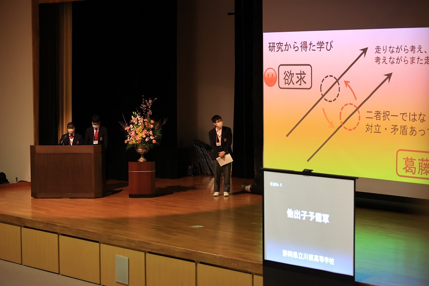 準グランプリ(浜松いわた信用金庫賞)は静岡県立川根高等学校による発表でした。地域の問題として「他出子」(進学や就職その他の理由で地元から出ていった子供のこと)をテーマとし、自身達を「他出子予備軍」と捉えて探求したものでした。地方からの人口流出を止めるという視点ではなく、一度流出するであろう「他出子予備軍」がどうすれば地元に帰省したくなるか、という視点で研究されたもので、研究手法の巧みさや地元・自分自身の問題として課題研究がなされていた点が評価されました。