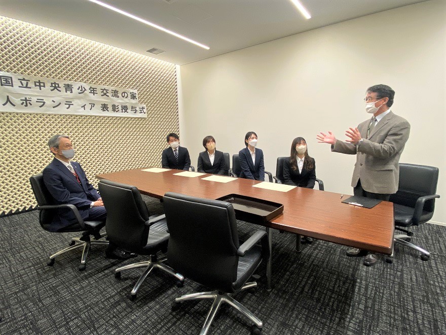 3月6日(月曜日)、常葉大学静岡草薙キャンパスにおいて『令和4年度国立青少年教育振興機構法人ボランティア表彰授与式』が執り行われ、教育学部初等教育課程4年生の黒田美里さん、杉山珠璃さん、法月沙恵さん、山下俊哉さんの4名が表彰を受けました。4名は国立中央青少年交流の家(静岡県御殿場市)が主催するイベントのボランティアに継続的に参加し、運営の中心として活躍した姿が評価され、この度の受賞に至りました。