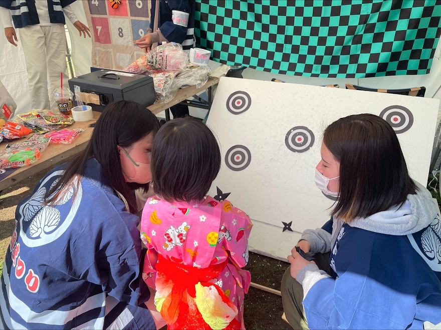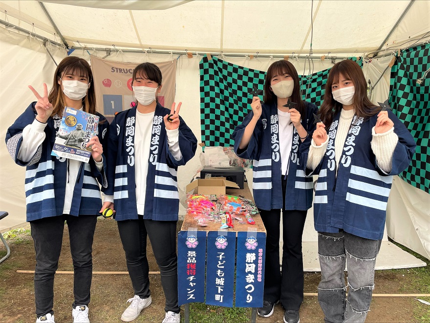 静岡まつりは、国内外から多くの方がいらっしゃる大規模イベントです。本年度は3日間で約93万人が来場されました。その中で参加した学生は、幼児や小学生のお子さんを対象とした「子ども城下町」の7ゲームの企画と運営に携わりました。