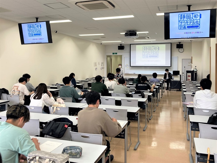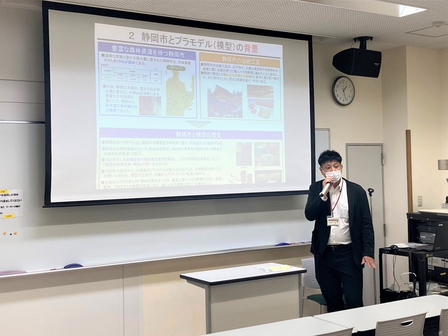 6月6日(火曜日)の授業では、静岡市の誇る主要な地場産業であり、『模型の世界首都・静岡』を目指すべくシティープロモーションを展開しているプラモデル産業について、市経済局産業振興課プラモデル係長の石川直哉さんをゲストスピーカーに招き、説明を受けました。