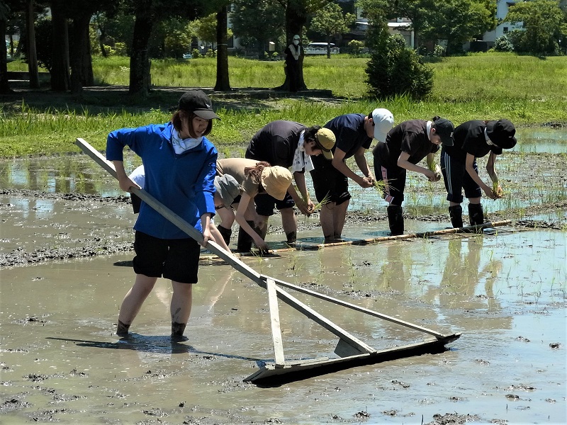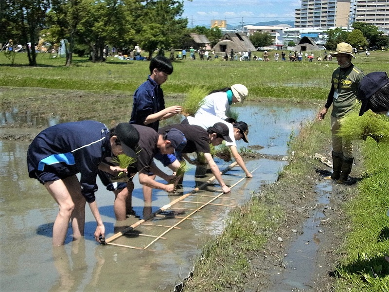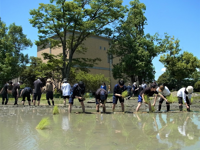 6月17日(土曜日)、教育学部生涯学習学科の学生14名、造形学部の学生10名が、登呂遺跡にある弥生時代の復元水田にて田植えを行いました。 これは登呂博物館が行っている水田サポーターの活動に参加したものです。登呂博物館学芸員の指導のもと、約200㎡の水田に苗を植えました。今後1年を通して、草取り、稲刈り、脱穀、もみすりと継続して行う予定です。 この活動は、地域の文化財や博物館と市民との関わりを学ぶ目的で、授業「博物館実習」の一環として行ったものです。 関連リンク 教育学部 教育学部についてはこちら 造形学部 造形学部についてはこちら 生涯学習学科 生涯学習学科についてはこちら