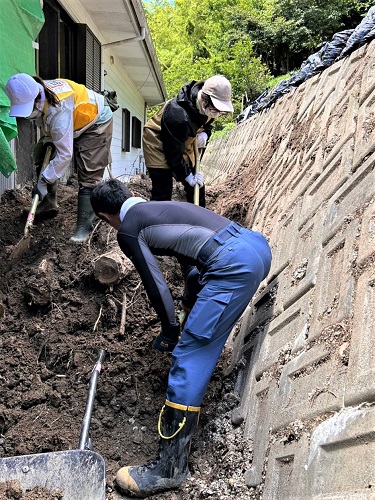 この日学生たちは、ご家庭まで流れ込んだ土砂をかき出し、一輪車で運び、トラックの荷台に運び入れる作業を行いました。水を吸っている汚泥はとても重く、一輪車のバランスをとることは難しかったですが、土砂の量を減らすことができました。現地の方にお話を伺ったところ「最初は崩れていることに気づかなかった。ガラスが割れる音で土砂崩れに気づいた。」と当時の状況を聞くことができました。