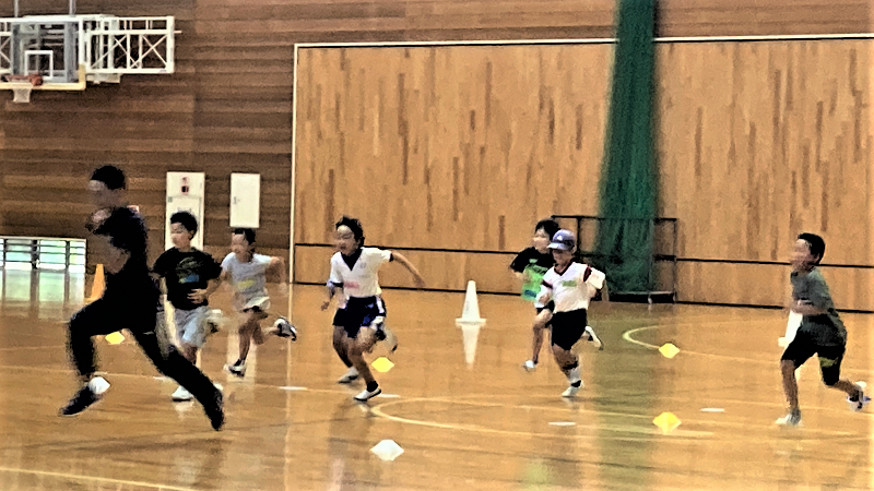 最初に鬼ごっこを行ったあと、大学生と競争し、大学生の速さを体感してもらいました。その後、カラーコーンを用いて、カラーに合わせた動作を行う神経系トレーニングを導入し、神経から筋肉への伝達スピードを高める練習を行いました。学生は、参加した児童一人ひとりに目を配りサポートをし、一緒になって練習に取り組みました。最後の選抜リレーでは、大学生と混合のチームを作りスポーツの楽しさを伝えました。