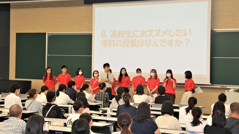 オープンキャンパスでは、模擬授業・学科説明・入試対策講座・キャンパスツアー・教員や学生による個別相談等を実施し、学生スタッフが笑顔で説明している様子が各イベントで見受けられました。